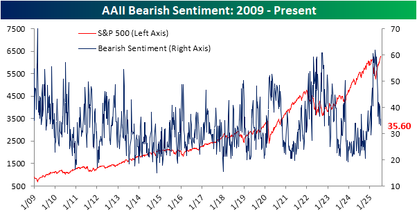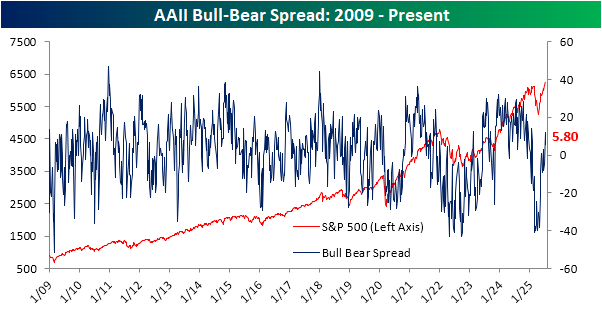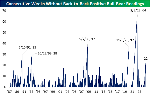 Even though the bull-bear spread was lower this week and current levels are far from earning any superlatives, the still positive reading did mark the first back-to-back positive readings in the spread since the last week of January. Alternatively, that snaps a 22-week-long streak without back-to-back weeks of positive bull-bear spreads. As shown below, such a streak has been uncommon. Throughout the history of the survey since 1987, there have only been five streaks that have gone on for longer.