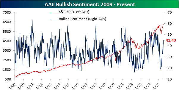Albeit the move has been mostly recovered by now, the past week's pullback from fresh all-time highs has resulted in investor sentiment shifting lower. The latest gauge from the weekly AAII survey showed 41.4% of respondents reporting as bullish, down from a 30-week high of 45.0% headed into the July 4th weekend.