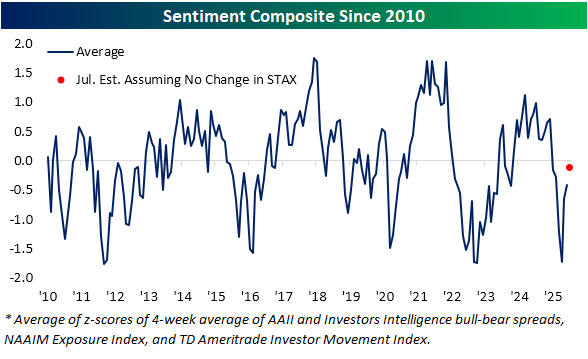 Putting sentiment readings together, below we aggregate this STAX index with the AAII survey and two other weekly sentiment readings: the NAAIM Exposure index and Investors Intelligence survey. Together and equally weighted, the average across these indicators pointed to continued improvements in sentiment in June, and readings for so far in July would point to further improvements down the road.