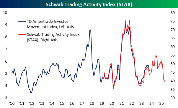 In addition to the usual weekly sentiment gauges, this week also saw an update in the Schwab Trading Activity Index (STAX). Formerly the TD Ameritrade Investor Movement index, before the merger between the two companies, the index differs from other sentiment gauges that tend to ask if an investor is bullish or bearish. Instead, this index uses a proprietary system to assign sentiment scores to retail investors based on their actual account activity. As shown, the June reading only indicated a modest improvement in sentiment after falling for three months in a row. In other words, since the April lows, retail investors had been fading the S&P 500's recovery back up to record highs, with June only marking a minor shift back toward bullishness among this investor base.
