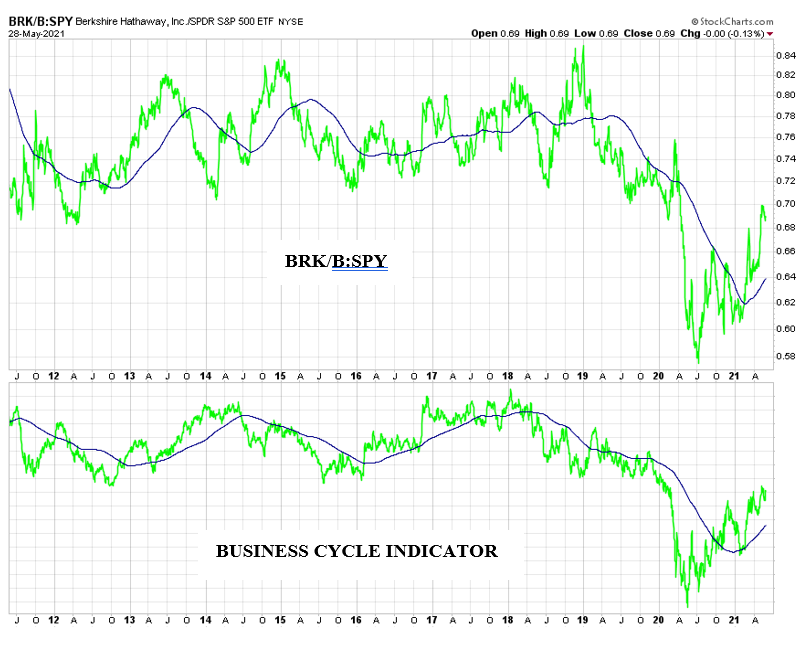 The above chart shows in the upper panel the performance of Berkshire compared to SPY (the graph shows the ratio of the price of Berkshire divided by SPY). The chart shows Berkshire outperforms SPY when the business cycle strengthens. It underperforms SPY when the business cycle declines. In other words, Berkshire performs like a bank stock during the business cycle.