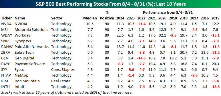 The table below lists the dozen S&P 500 stocks that have experienced a median gain of at least 4% and traded higher at least 80% of the time from the close on 8/4 through 8/31. Topping the list, NVIDIA's (NVDA) gain during this period has been 10.5% with gains 90% of the time. NVDA has become the face of AI since Chat GPT's 2022 launch, but from 2015 through 2021, it also traded higher during this period each year. Along with NVDA, the only other stocks in the table that traded higher 90% of the time were Motorola Solutions (MSI) and Iton Mountain (IRM). What also stands out about the names on the table is that all but two of them are from the Technology sector.