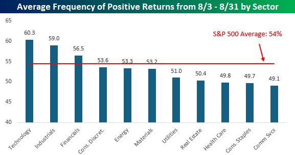 Just about all of the stocks listed on the table of best performing stocks from the close on 8/4 through month-end are from the Technology sector, and the chart below further illustrates the strength of the sector during this period. As shown, stocks in the sector have traded higher an average of 60.3% of the time from 8/4 through 8/31. Not far behind, stocks in the Industrials sector have traded higher an average of 59% of the time, followed by Financials with gains 56.5% of the time. These three sectors are also the only ones that have had a higher winning percentage than the S&P 500. To the downside, the only three sectors that have traded higher during this period less than half of the time are Communication Services, Consumer Staples, and Health Care.