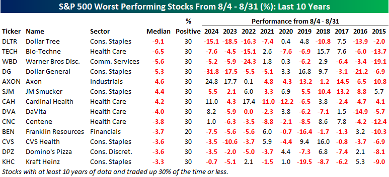 On the downside, the table below lists the thirteen stocks in the S&P 500 that have had a median decline of at least 3% from the 8/4 close through month-end, with gains 30% of the time or less. Topping the list of losers is Dollar Tree (DLTR) with a median decline of 9.1% and gains just 30% of the time. This has been an especially weak time of year for the stock over the last four years, as it has declined at least 7.4% each time. Axon (AXON) is another notable name on the list. Even with a median decline of 4.6%, it has been up during this period for three straight years with gains of 0.1%, 17.7%, and 24.8%, respectively. Unlike the list of winners, which was almost entirely Technology sectors, the list of losers is much more diverse, with six sectors represented, even as five are in the Consumer Staples sector.