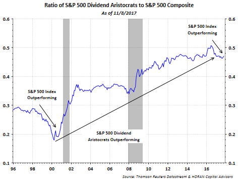 Every investor makes investment decisions that are influenced by ones biases that form over time. These biases may come in many forms but they tend to fall into a couple of categories, emotional or cognitive. I mention this because it is not that uncommon that I sit down to write a blog post on a certain topic thinking the post's conclusion will go in one direction, but end up with a different conclusion after evaluating some of the research. Some of these blog topics are developed by flipping through a lot of charts, which I do frequently. One such chart is below and shows the relative performance of the S&P 500 Dividend Aristocrats to the S&P 500 Index.