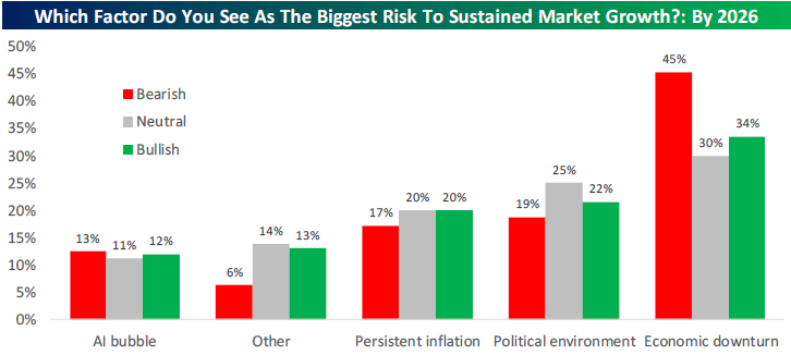 Below we've broken out the response rates to our question on the biggest risk to sustained market growth by whether the survey participant is bullish or bearish on the stock market in 2026.