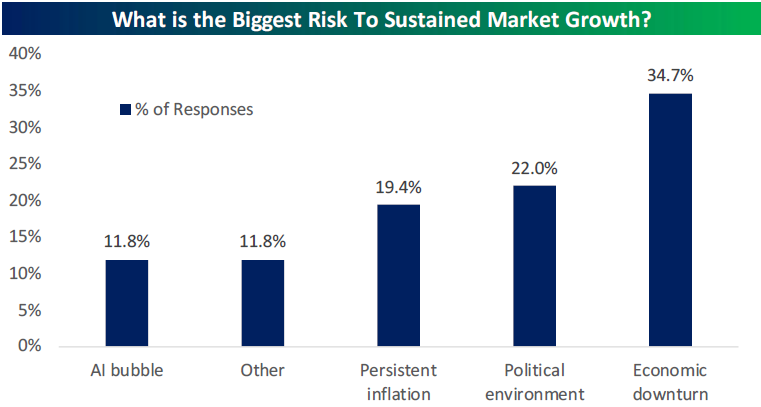 In a survey of investors (using Bespoke's large client base) at the end of 2025, we asked participants what the biggest risk is to sustained market growth in 2026 and beyond. As shown in the chart below, an "AI bubble" actually ranked as the least concerning issue of the various options provided. The answer that received the most votes at 34.7% was actually an "economic downturn," followed by the "political environment" at 22% and "persistent inflation" at 19.4%. "Other" received 11.8% of the vote, which was the same response rate that an "AI bubble" received.