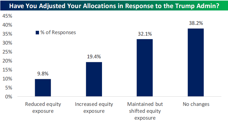 What we found, though, is that while most investors have either made no changes or merely maintained but shifted equity exposure due to the Trump Administration, a considerably higher percentage (19.4%) said that they've increased equity exposure than those that said they've reduced exposure (9.8%). This suggests to us that regardless of whether you like Trump or not, the admin should remain a tailwind rather than a headwind for the market at least for another year or so. Again, jumping in or out of the market based on who's President is not recommended.
