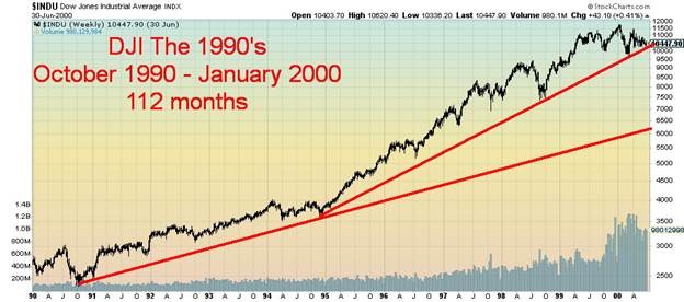 All in all the 1990s’ bull saw the DJI gain 396% leaving it short of the gains of both the DJI of the “Roaring Twenties” and the Japanese market of the 1980s. But in terms of length it might not ever be seen again. Unless the current bull has even more life.