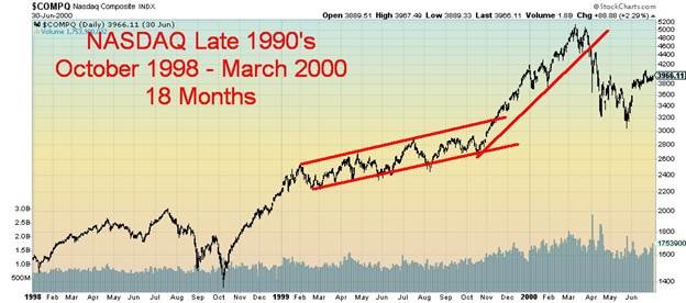 There are numerous examples in the past. The best ones are: the “Roaring Twenties” 1921–1929 that really got underway in late 1926, culminating in the blow-off top into September 1929; the gold market of the 1970s (1971–1980) that ended in a blow-off that started in April 1979 and ended in January 1980; the Tokyo Nikkei Dow of the 1980s (1982–1990) that ended in a blow-off into January 1990; the 1990s High Tech/Internet market (1990–2000) and subsequent blow-off known as the Dot-com bubble that started in October 1999 and ended for the Dow Jones Industrials (DJI) in January 2000, and, for the Nasdaq and the S&P 500 in March 2000.