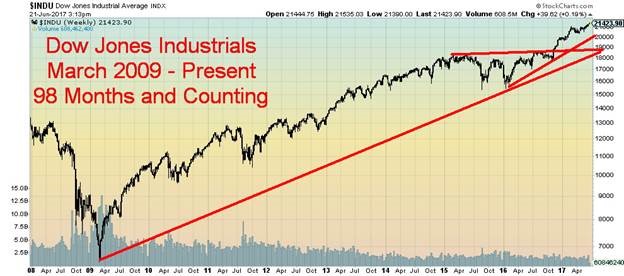 Okay, maybe that is extreme. Naturally, there are many reasons writers give to back up their case. Those range from the election of Donald Trump, Brexit, rising interest rates in the US, and of course the best one—that the bull market is now into its ninth year from the major low of March 2009 without a correction exceeding 20% and is in the mother of all bubbles. All of that is true. But none of that makes for a final top just because the stock market has been rising for eight years plus.