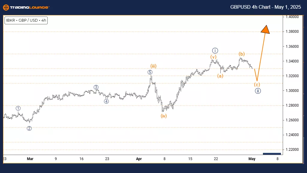 The GBPUSD 4-hour chart review highlights a counter-trend correction forming within a larger bearish setup. The pair has finished the navy blue wave 1 drop and has entered into the navy blue wave 2 correction inside the broader gray wave 1 downtrend. This structure suggests a short-term upward retracement is in motion before the potential continuation of the main bearish trend.