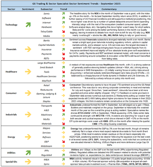 Looking forward, Goldman’s top traders expect October to be more difficult. According to their desk commentary, while flows remain constructive overall, positioning is heavy in technology and momentum names, leaving the market vulnerable to even modest shocks. Their sector view highlights caution in consumer discretionary and industrials. These areas are likely at risk of slowing economic growth. However, they expect energy and healthcare to remain relative outperformers.