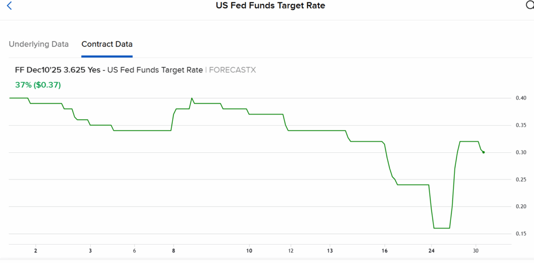 Clearly this was not welcome news for those traders who had been expecting a third cut before the end of the year. CME futures were pricing in at least a 92% chance of a December cut to follow the near 100% probability of yesterday’s cut. Those slipped to below 70% after Powell’s comment. The pricing on IBKR ForecastTrader was not quite as extreme, pricing in no less than a 15% chance of a December rate target above 3.625%, but the views now roughly match those shown by the CME.