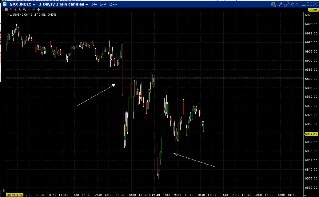 This was a near exact repeat of the activity at during the September FOMC press conference.We noted that day’s 1% drop and bounce back to near-unchanged levels. The plunge occurred later in that press conference, but the rebound was even more swift.