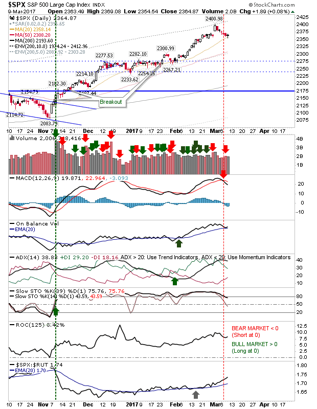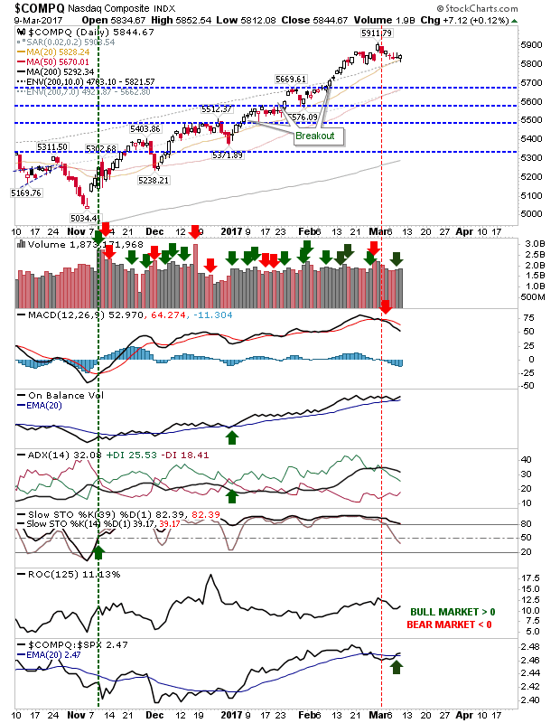 The Nasdaq finished higher after a defensive push off its 20-day MA. This didn't make any significant changes to the technical picture, but it does suggest the possibility a new swing low is in play.