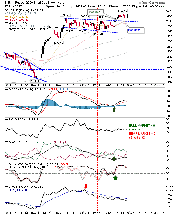 Traders had the weekend to study the opportunities and decided there was value to be found in Small Cap stocks. The Russell 2000 added nearly 1% as the positive test of the breakout, 20-day and 50-day MAs expanded. The index did see a relative performance gain, but not enough to trigger a new 'buy' in this indicator.