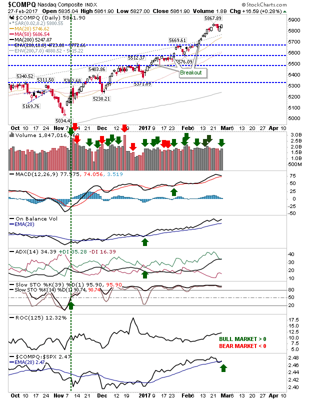 The Nasdaq registered an accumulation day on higher volume accumulation. These gains were enough to reaffirm the 'buy' trigger in relative performance, but this will likely slow after a strong 2017.