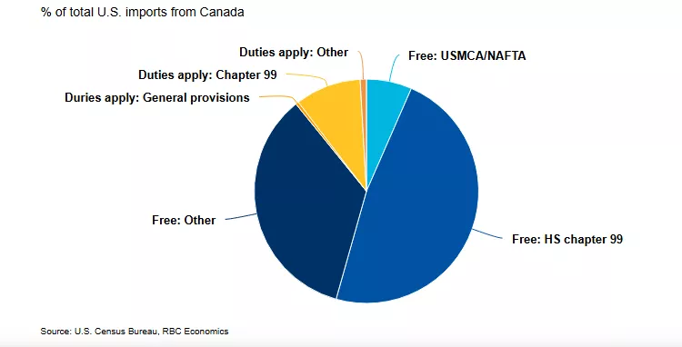 While it is daunting for those industries that have been singled for specific tariff applications, on the whole Canadian exports are largely duty free or subject to relatively small tariffs, such as 10% in the energy sector.