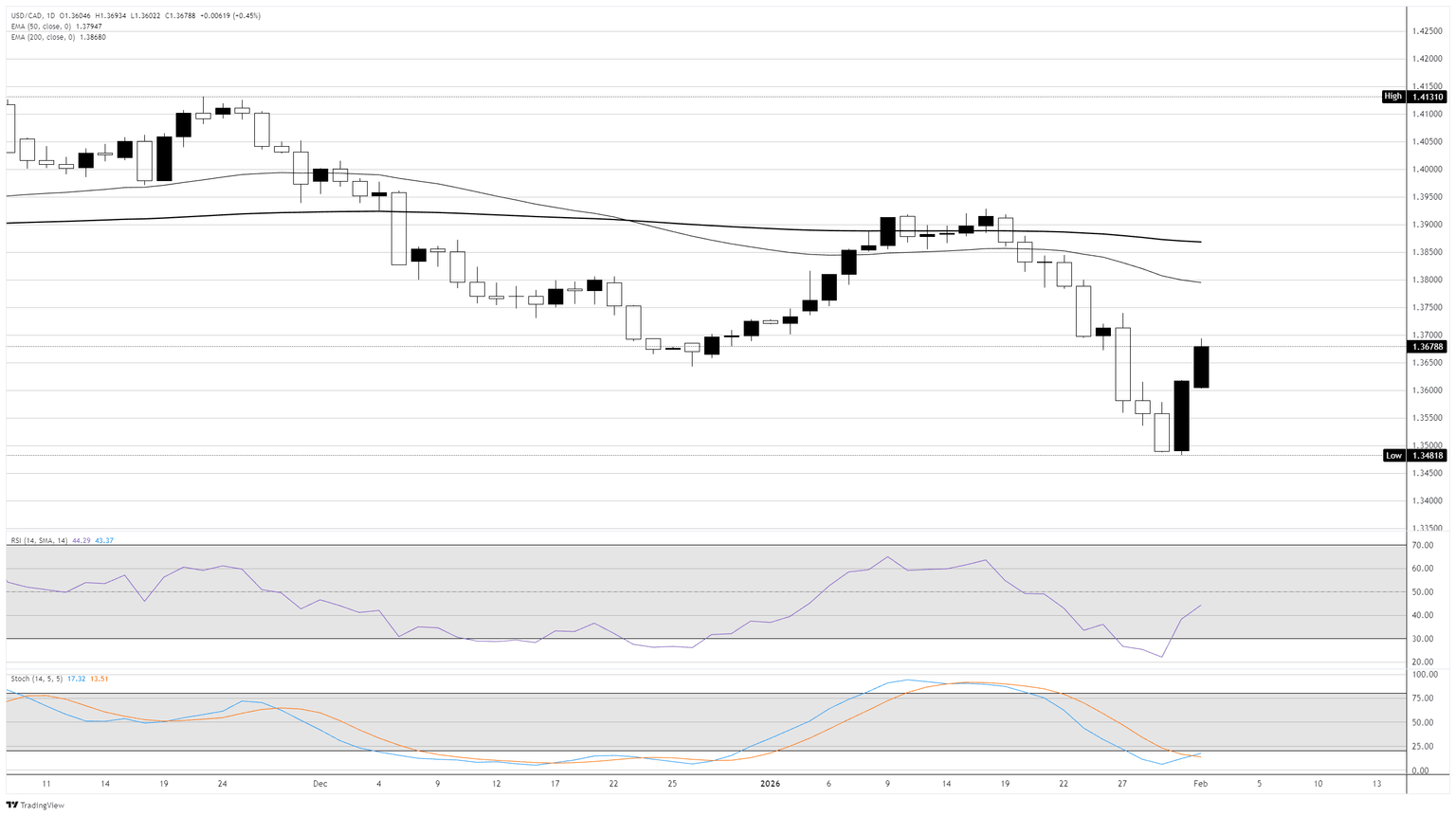 Near-term resistance is seen at 1.3670, backed by the 2026 yearly open at 1.3725. Bulls would need a weekly close above this region to suggest a more significant low is in place. With official US data now suspended due to the government shutdown, volatility could remain subdued until markets receive fresh catalysts. The broader bias remains bearish while price holds below the 50-day EMA, though the absence of key economic releases may keep USD/CAD range-bound in the near term.
