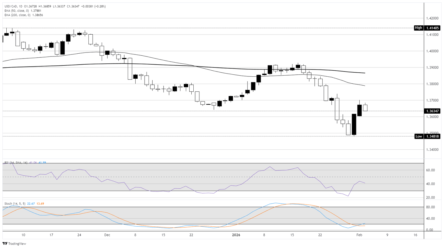 The 200-day EMA at approximately 1.39 represents the next key resistance level, with a sustained break above this threshold needed to suggest a more meaningful reversal of the recent downtrend. On the downside, support is seen near the recent lows around 1.3490-1.3500, with a break below opening the door toward 1.3400. The Relative Strength Index (RSI) has rebounded from oversold territory and sits in the mid-40s, indicating neutral conditions with room for the pair to move in either direction.