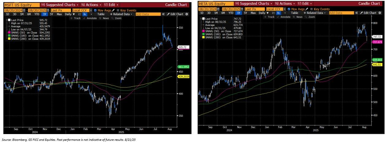 The desk chatter tells the story. Yesterday’s flood of inbounds started with “why the selloff?” but by the afternoon, the calls had flipped—“why the bounce?” Traders are watching intraday reversals in Oracle (ORCL), Nvidia (NVDA), Meta (META), like they’re trying to decide if this is tactical dip-buying or just shorts covering in a thin market. The truth: big tech is starting to line up around the 50-day moving average. MSFT, META are both sitting on it like it’s a lifeboat. Nvidia has already pulled back 8.5% off the highs—a garden-variety 5–10% tactical shakeout before earnings, not yet the stuff of structural breakdown.