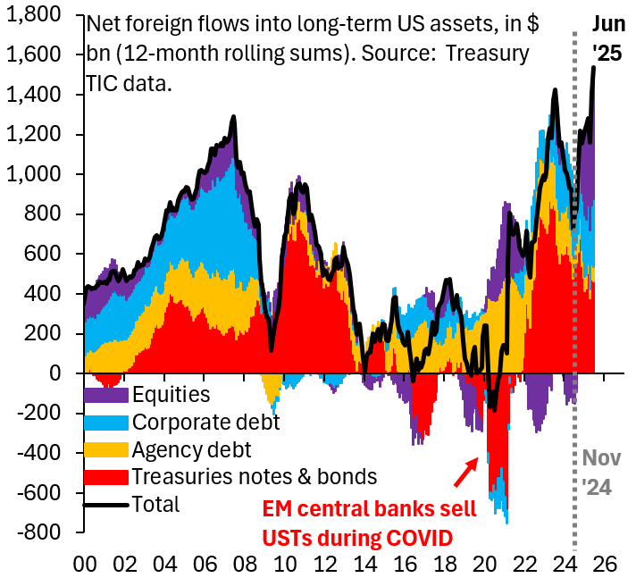 The data don’t lie. TIC numbers show foreigners snapped up $192 billion in U.S. securities in June, hot on the heels of May’s record-smashing $326 billion. Even after adjusting for Americans’ own purchases of offshore assets, net long-term inflows into U.S. paper clocked in at $151 billion in June, bringing the second quarter haul to $410 billion—essentially matching the all-time record. Stretch the lens: first half inflows of $643 billion put us on pace to rival the $1.3 trillion tsunami of 2022. Over the last 12 months, a cool $1.27 trillion has found its way into Treasuries, agencies, corporates, and equities. American exceptionalism is far from dead.
