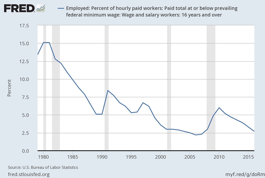 "In 2016, 79.9 million workers age 16 and older in the United States were paid at hourly rates, representing 58.7 percent of all wage and salary workers. Among those paid by the hour, 701,000 workers earned exactly the prevailing federal minimum wage of $7.25 per hour. About 1.5 million had wages below the federal minimum. Together, these 2.2 million workers with wages at or below the federal minimum made up 2.7 percent of all hourly paid workers. The percentage of hourly paid workers earning the prevailing federal minimum wage or less declined from 3.3 percent in 2015 to 2.7 percent in 2016. This remains well below the percentage of 13.4 recorded in 1979, when data were first collected on a regular basis ..."