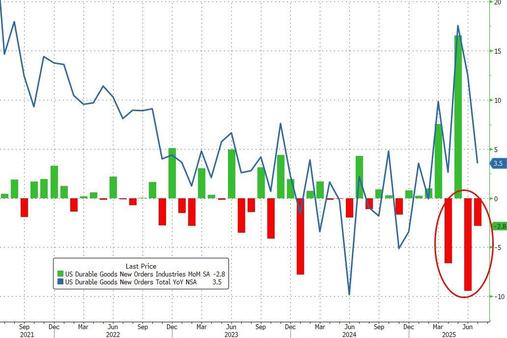 Amid chaotic swings MoM driven by the variability of Boeing plane orders, analysts expected preliminary July data to show a 3.8% MoM decline (following June's big plunge, following May's big surge). The good news is that the actual print was better than expected (-2.8% MoM) but still in the red for headline orders. This dragged down the YoY headline growth to 3.5% as the front-running of tariffs fades and earlier this month, Boeing Co. reported a fewer orders in July than in June.