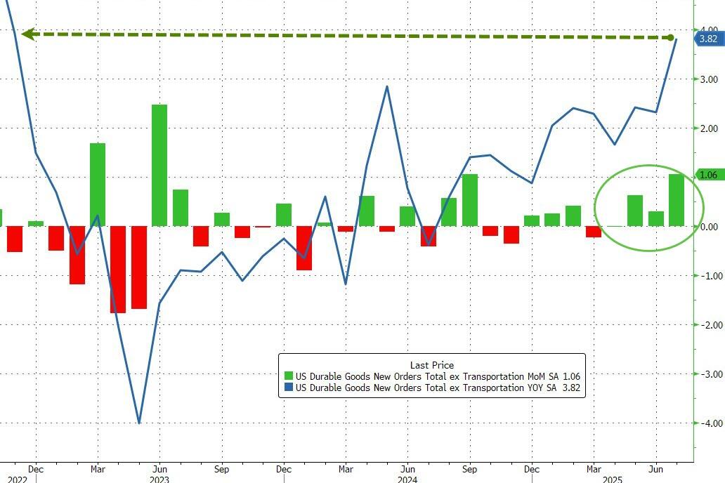 Under the hood, ex-Transports, durable goods orders rose over 1.0% MoM (the fourth straight month of gains), lifting core orders 3.8% YoY - its strrongest growth since Nov 2022...