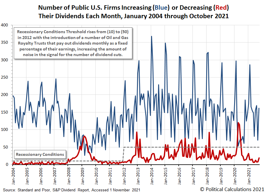 - Standard and Poor counted 162 U.S. firms announcing dividend rises in October 2021, an increase of 92 over the number recorded in September 2021 and a decrease of 23 from the 185 recorded in October 2020.
