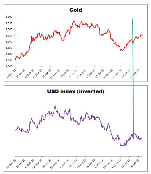 Since the beginning of February 2017 gold has been demonstrating substantial strength against the US dollar. Look at the charts below and the green, vertical line: