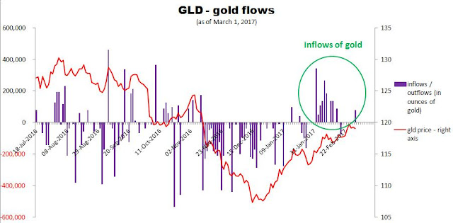 Since the beginning of February 2017 GLD has been reporting only inflows of gold (except for February 17 when 76 thousand ounces left GLD vaults).