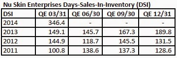 In the latest quarter ended March 31, 2014 (Q1 2014), Nu Skin's reported revenues exceeded its maximum revenue projection by $1.1 million. Its cost of goods sold increased by 18.6% over the previous year's first quarter (Q1 2013). However, its inventories mushroomed 175.5% to $410.7 million compared to $149.1 million in the same period of the previous year. It took Nu Skin 346.4 days to turn its inventory into sales in Q1 2014 compared to only 149.1 days in Q1 2013, an increase of 132.3% extra days to sell its products. In Q1 2014, DSI was over three times the level it was in Q1 2011.