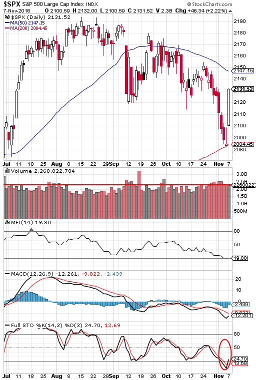 In one day the S&P 500 Index recovered six of the nine days of losses incurred over the last two weeks. Today the S&P 500 Index recovered 46.34 points or 2.22% versus the 66.15 point loss (-3.07%) incurred from 10/25 through 11/4. Today's rally did not occur on exceptionally high volume, but the stochastic indicator has turned positive.