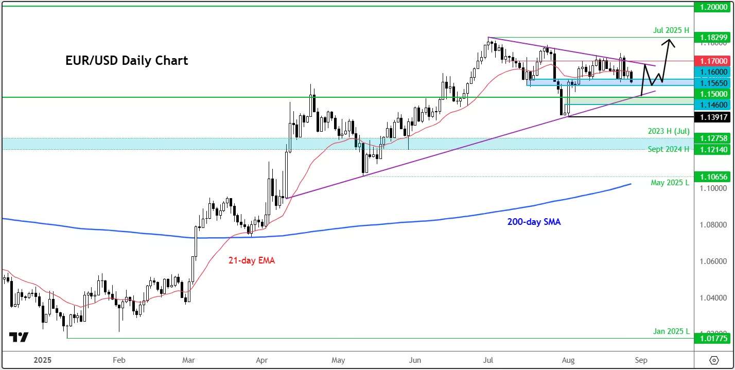 - Core PCE Price Index (Friday, 29 August – 13:30 BST):Friday’s release is arguably the one to watch. The Core PCE is the Fed’s preferred inflation gauge, and with CPI softening but PPI running hot, the story seems to be that firms are swallowing tariff costs rather than passing them on. This tug-of-war leaves the Fed in a tricky spot. Policymakers have held off on a rate cut for now, but they’ve all but admitted they’re prepared to move in September if the data keeps leaning that way.