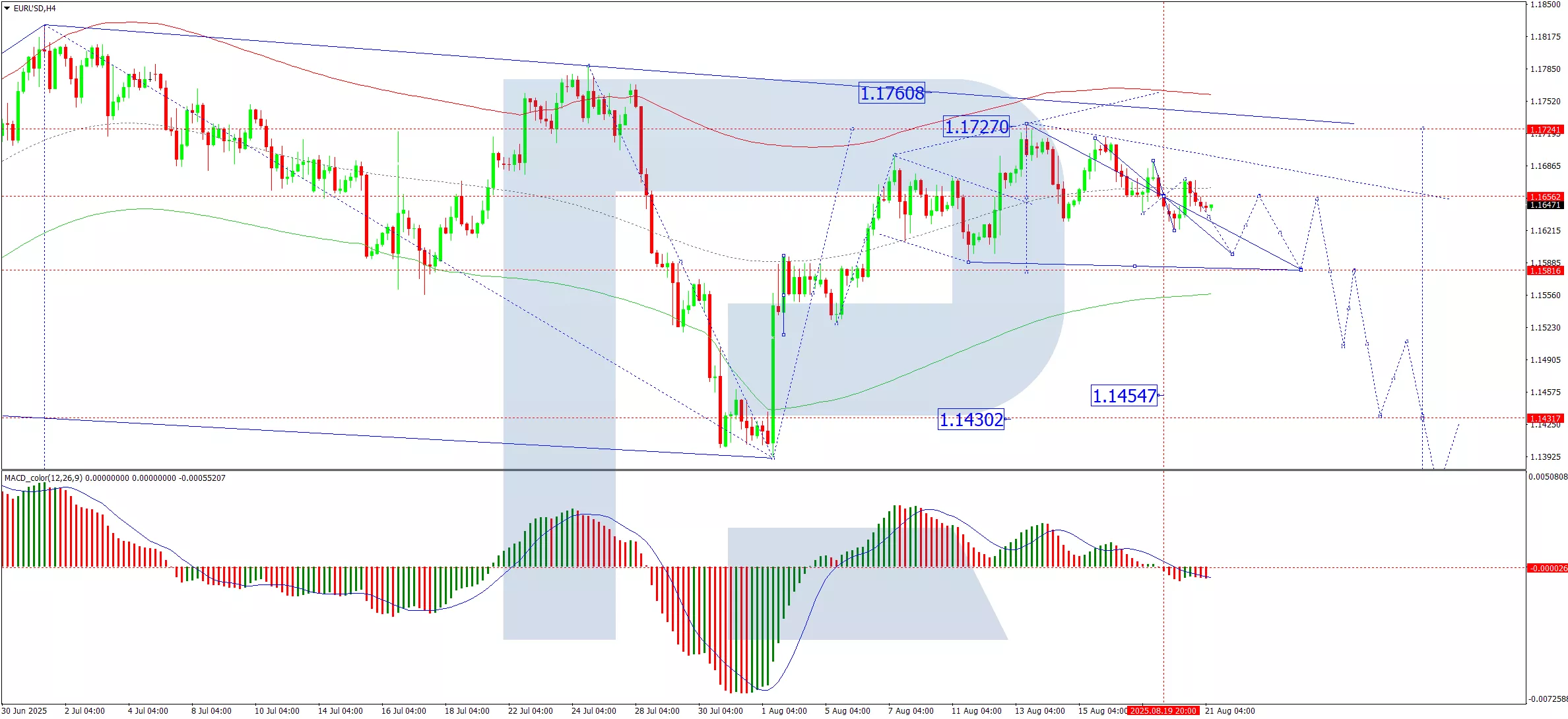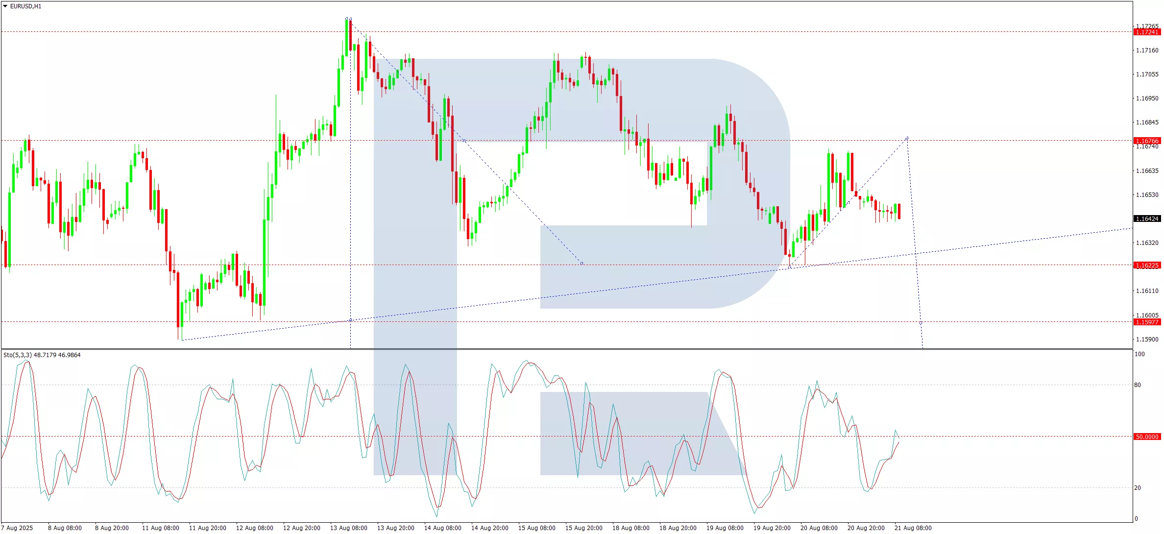 On Thursday, the EUR/USD pair is trading around 1.1646, consolidating after the previous session’s volatility. The market is stabilising following the recent US dollar rally, driven by expectations ahead of the Federal Reserve’s annual symposium in Jackson Hole. Investors remain cautious before Fed Chair Jerome Powell’s speech, seeking clarity on interest rate prospects and any potential adjustments to expectations of rapid monetary easing.