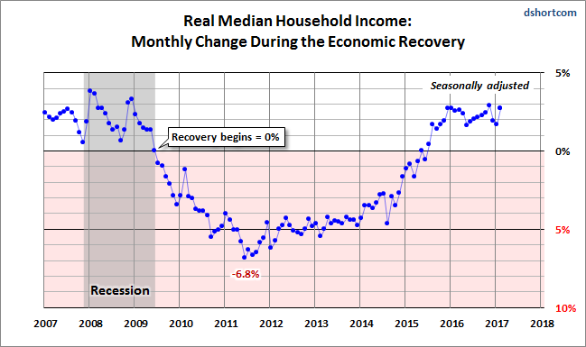 “The 1.0 percent increase in median household income in February 2017 to $58,714 brings us to the point where real median household income over the past year was essentially flat (the February 2016 median was $58,619). We continue to monitor the course of inflation, as this has a significant effect on the trend in real median annual household income. It is encouraging that the CPI for all items increased by only 0.1 percent between January 2017 and February 2017, compared to an increase of 0.6 percent between December 2016 and January 2017. We are now at a point now where real median household income is 0.8 percent higher than at the beginning of the great recession in December 2007, and closing in on the level of $58,918 January 2000, the beginning of this statistical series.”