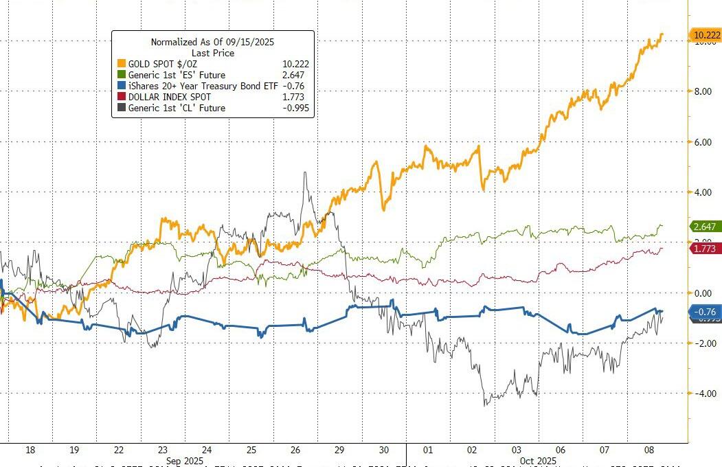 Since the last FOMC meeting (when The fed cut rates by 25bps with one dissent for 50bps on Sept 17th), gold has gone to the moon, stocks are higher (as is the dollar) while bonds are down modestly...