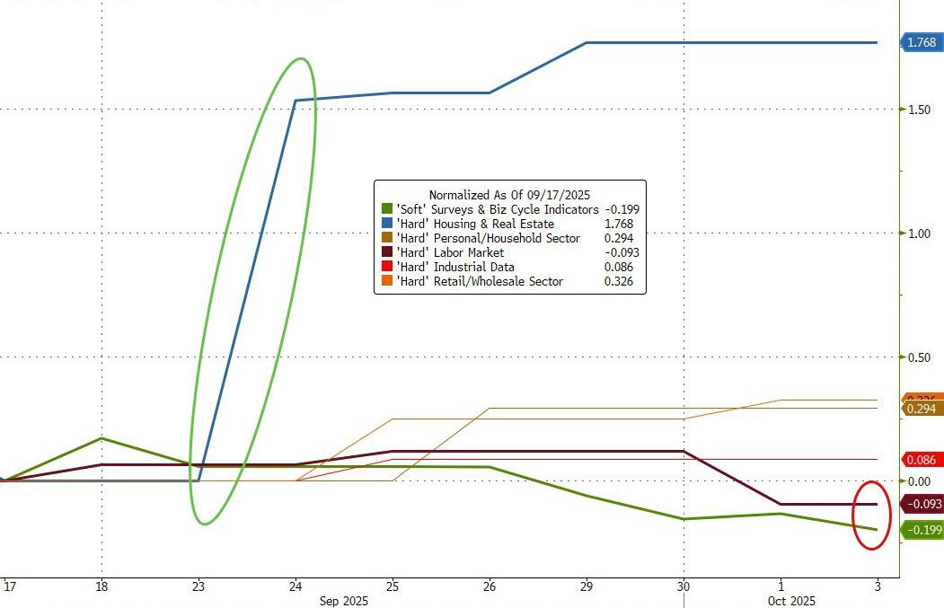 Despite the lack of data (due to the government shutdown), the labor market is cooling, and now policymakers are turning their attention to that side of the mandate (though we note that housing data saw a huge upside surprise while soft survey data since the FOMC meeting has weakened)...