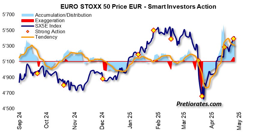 However, the Euro Stoxx 50 is showing the first signs of a hangover after the party. “Exaggeration” (red area) and “Strong Action” (yellow dot) signal a possible end to the trend. This is a familiar pattern – when both occur simultaneously, a trend reversal often follows.