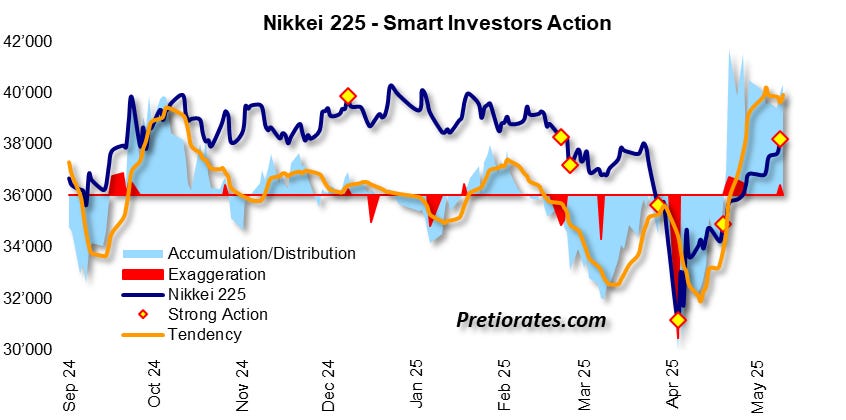 Asia is dancing along, led by Japan. The Nikkei has been heavily accumulated. But here, too, we are now seeing warning signs: exaggeration meets strong action – déjà vu?