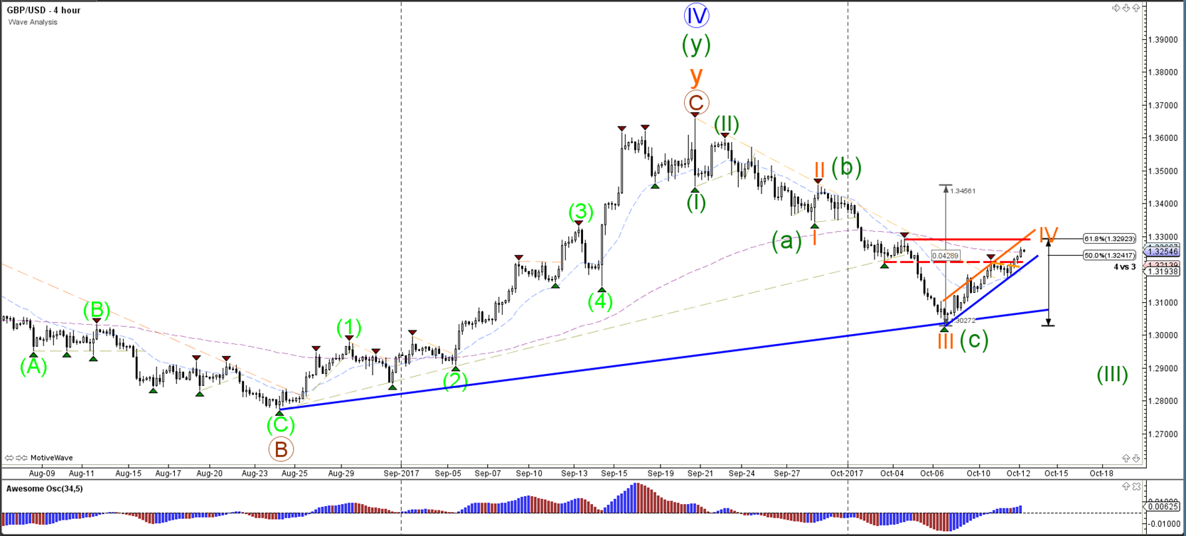 The GBP/USD bearish break below the support trend line (blue) could indicate the completion of wave 4 (orange) and the continuation of the downtrend. A break above the resistance top and 61.8% Fib makes a wave 4 less likely. For the moment an ABC (green) zigzag correction could be taking place.