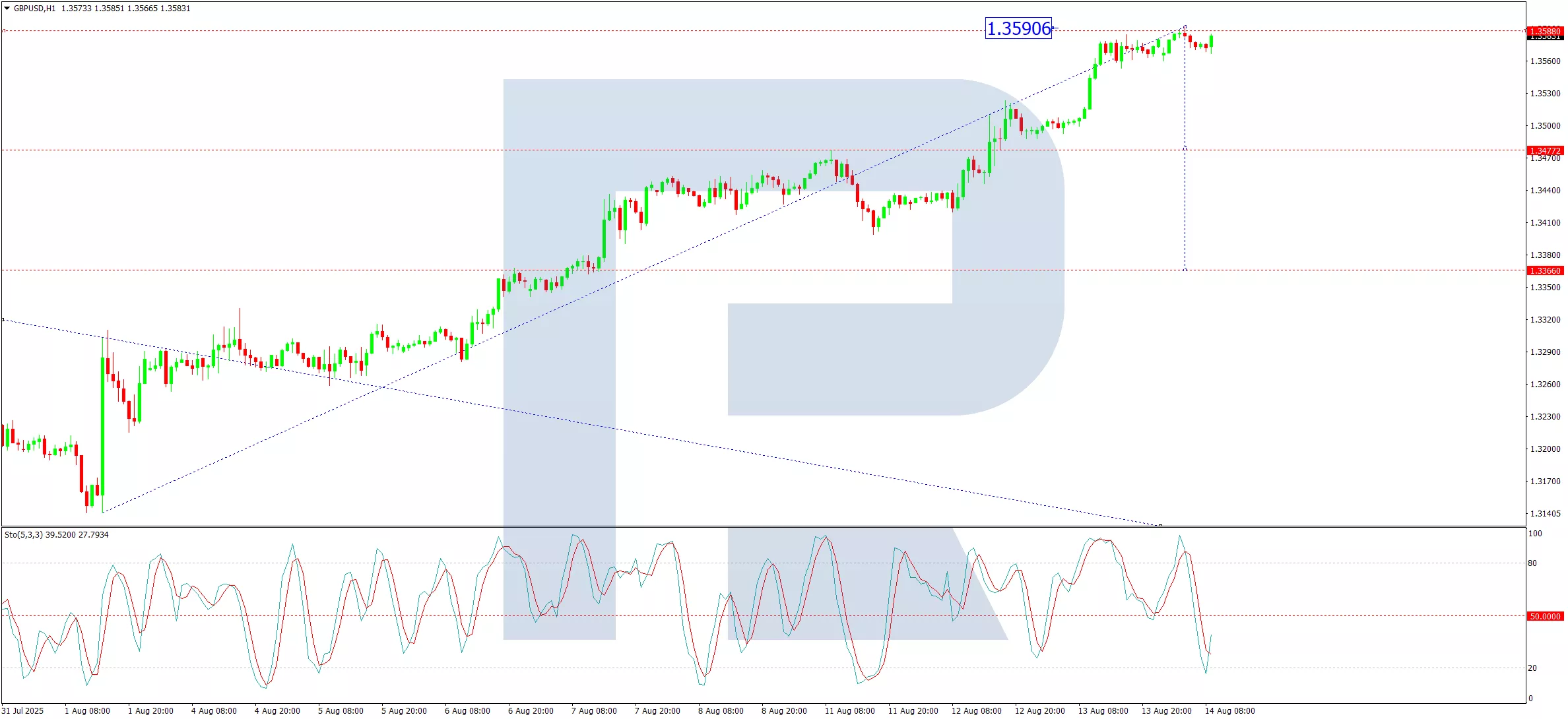 The H1 chart shows the pair consolidating around 1.3366 before breaking upward and completing a corrective stretch to 1.3590. From here, we expect a new downward wave towards 1.3477, with a breakout potentially extending the decline to 1.3366—the initial target for the bearish trend. The Stochastic oscillator corroborates this outlook, with its signal line below 50 and trending sharply downward towards 20.