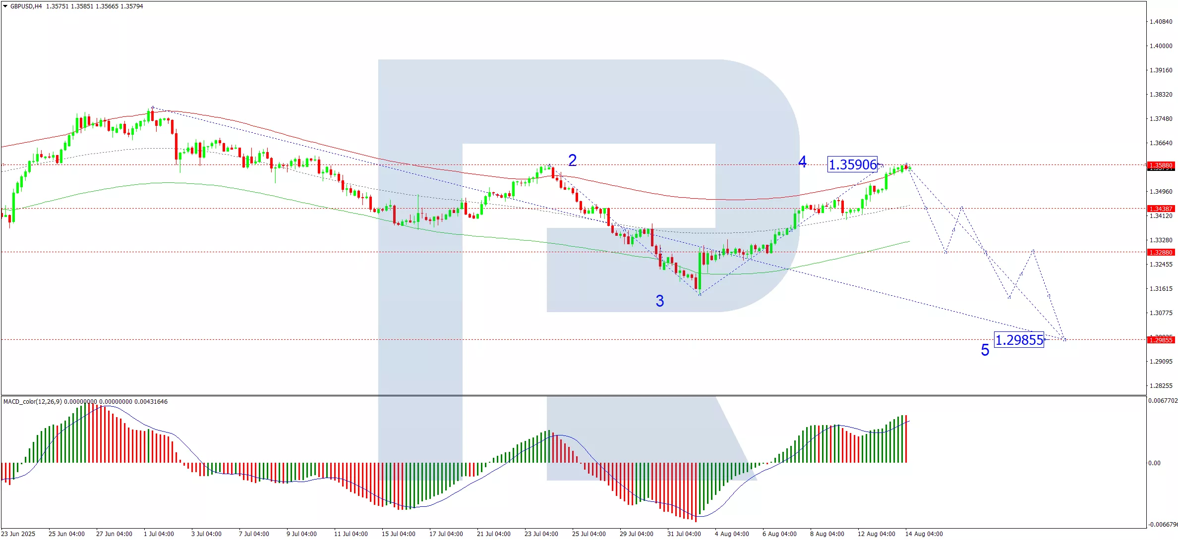 On the H4 chart, GBP/USD has corrected to 1.3590. We now anticipate the start of a fifth downward wave, targeting 1.2942, with the first structural support at 1.3280. This scenario is supported by the MACD indicator, where the signal line—currently at its peak—is poised for a downturn.