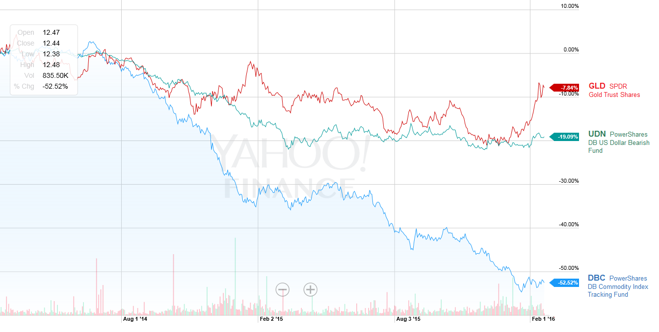 It's not a very good correlation either. Note that in the sharp, late 2014 commodities swoon, the dollar followed commodities, but gold clearly started to follow something else. Then gold and the USD started to dance together for awhile, as is their custom - until late 2015. Here gold is bolting away from both commodities and the inverse dollar.