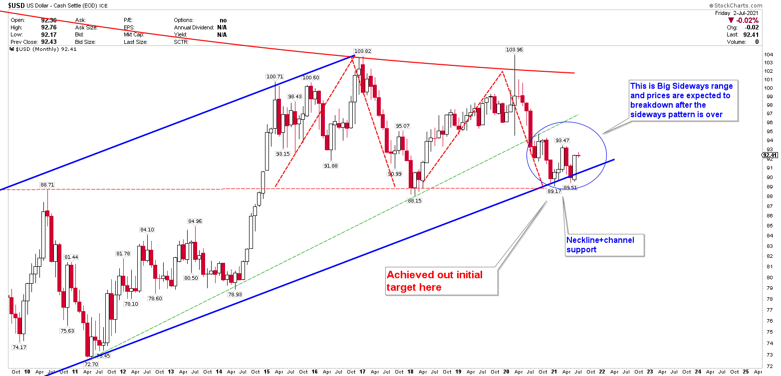 The monthly chart is zoomed out to observe the details. A red circle is marked which indicates that prices can be in a sideways range and once the range is over, the US dollar index must break downside.