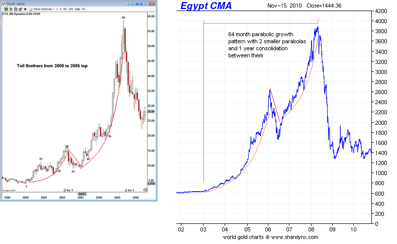 This basic pattern of a parabolic growth phase going into a cool down trend, then a new parabolic growth phase, typically more violent than the first, has been repeated many times in history totaling 64 months give or take a couple months. That sounds kooky when differing bull markets are controlled by vastly different causes in different times. But such is the fractal nature of markets. David Nichols is probably the leading explorer into market fractals and offers The Fractal Gold Report where he explains some of this weird stuff and monitors mainly the gold market. Below is an example of his month counting on Toll Brothers during the housing bull alongside another national bull market of the 64 month variety that I found on my own: