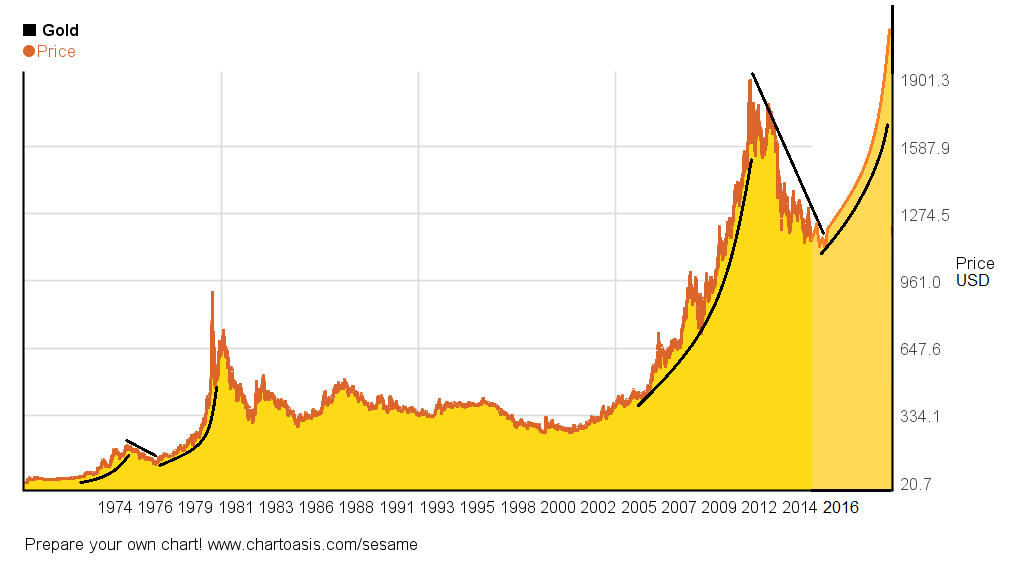Homestake Mining was a major gold miner in the 1930s and led a huge boom in gold mining then. Brazil was a case of currency instability. Fractal behavior is primarily a reflection of human psychology. As such, it has particular utility with gold and currency issues. Gold, as Warren Buffett sarcastically points out, doesn't produce anything of value while we pay to dig it up, put it in another hole, and pay to have it guarded. The only value it has is what human psychology puts on it. It's true that 68% of gold demand is jewelry and technology, but that's always been true of gold, and it hasn't stopped these fractally charged bull markets of the past from occurring. Speaking of which, was the gold bull of the 1970s such a fractally charged thing?: