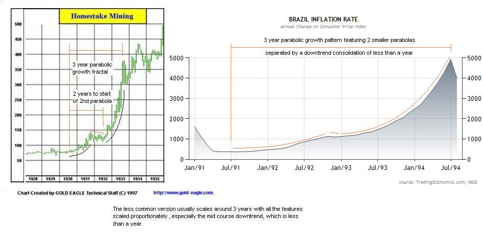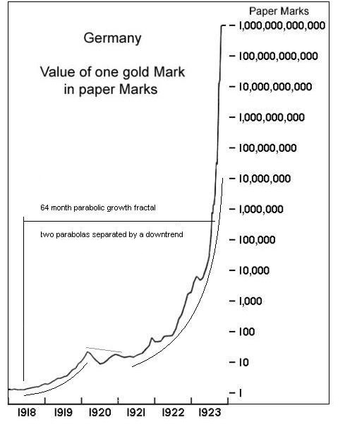 The steady decline of gold since the 2011 peak is generally thought of as a bear market. But I would like to explore the possibility that a very large scale bull market actually includes this 4 year decline, and may be departing into a phase 3 of this type of bull market, agreeing with the tell of the South African miners. Major bull markets tend to run in repeating patterns or fractals. Markets, as well as many things in nature, move in these patterns at different scales. One such pattern I have written about before is the separated parabola. An example of this is the currency market of 1920's Germany, which was the most prevalent scale of this fractal, the 64 month: